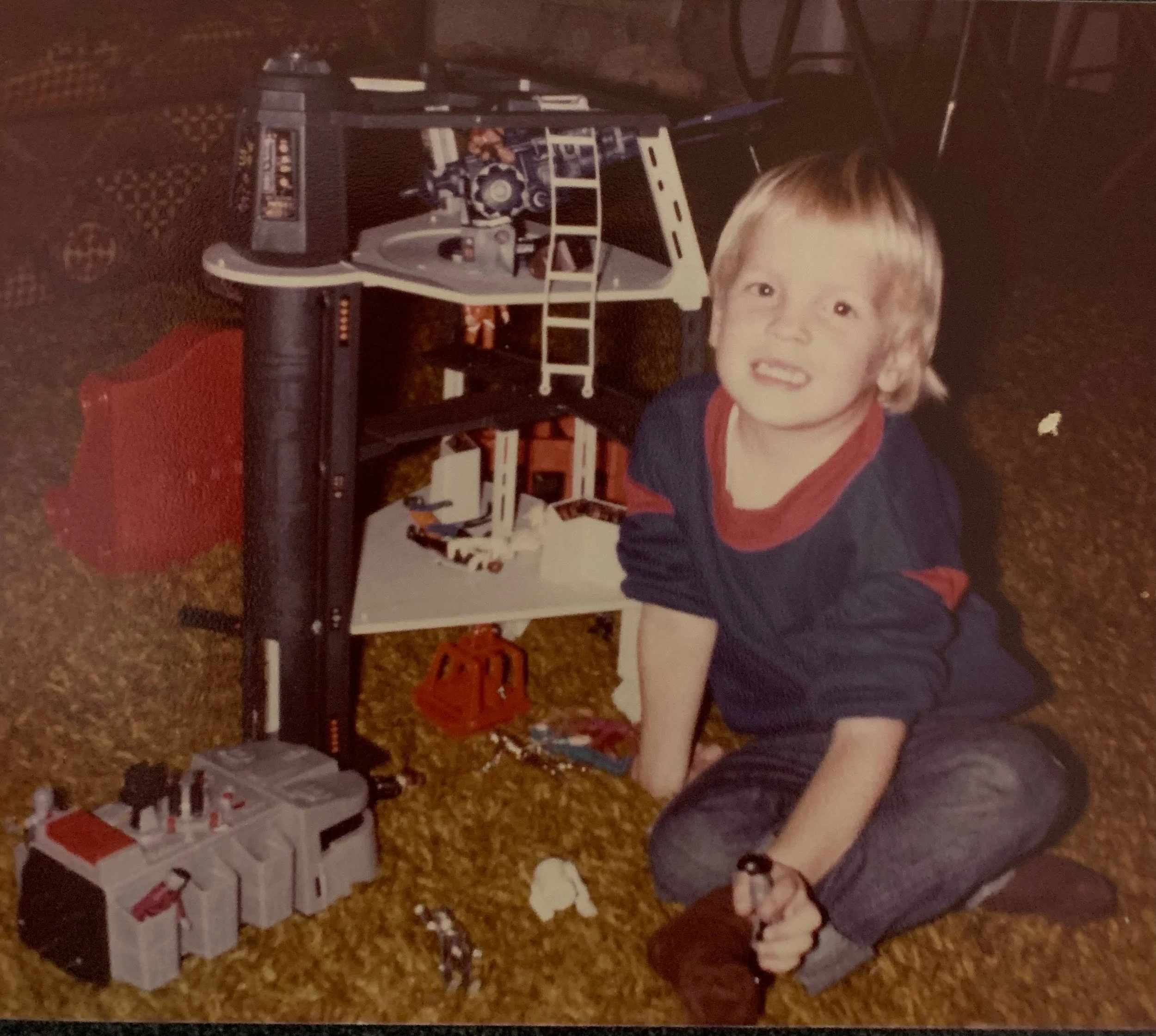 • A young boy with blond hair, wearing a navy blue shirt with red accents and dark pants, sitting on a brown carpeted floor, smiling at the camera, surrounded by construction toys and a toy workbench.